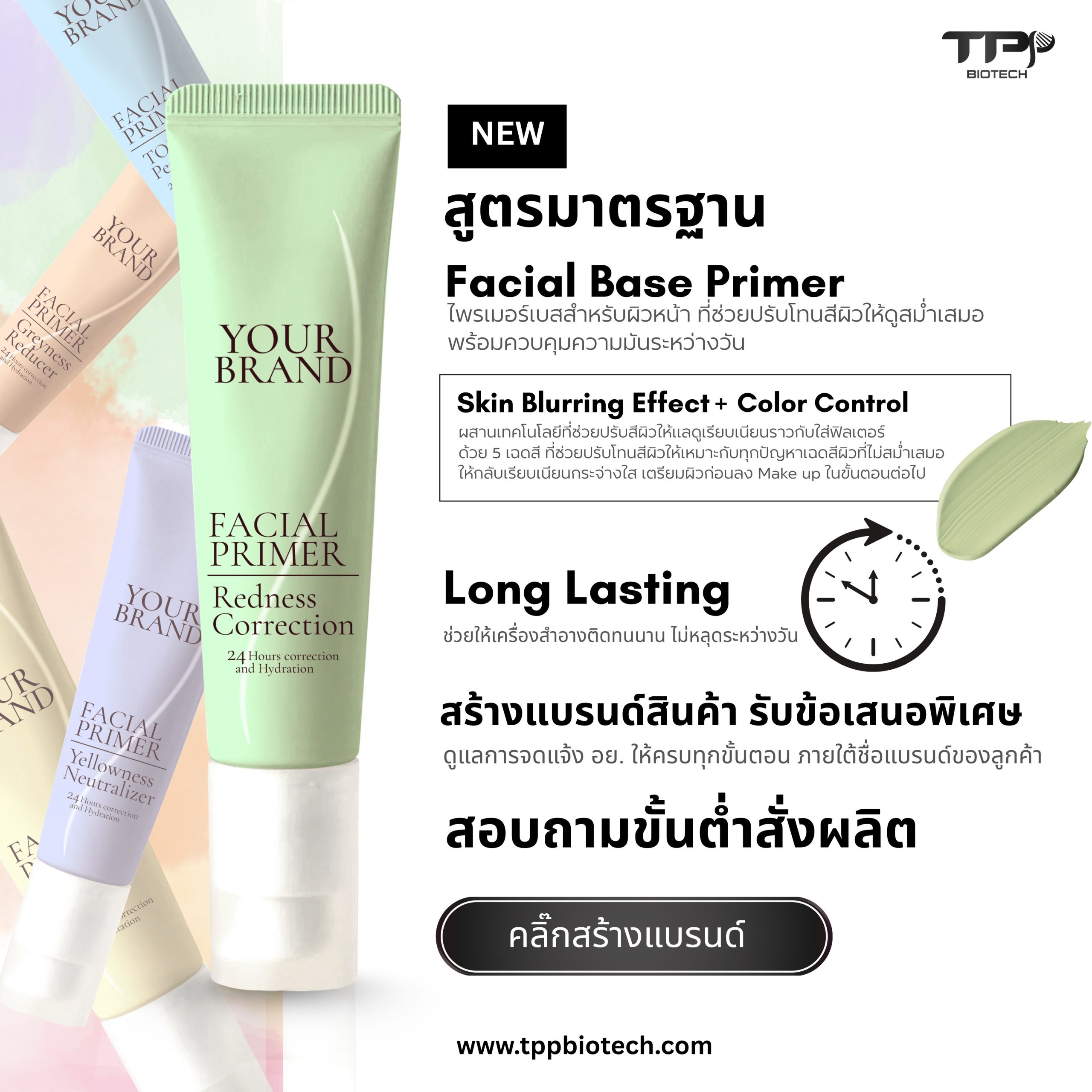 A primer is a product that creates a thin layer between your skin and foundation, which helps control oil, minimize pores, smooth the skin’s texture, and make foundation adhere longer. This is especially true for products developed with OEM cosmetics manufacturers, who can tailor textures and ingredients for Thai skin, such as a silicone-based texture for oily skin or a lightweight gel for dry skin.