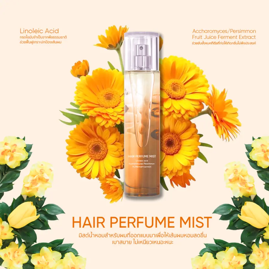 Hair Perfume Mist มิสต์สูตรบางเบาให้เส้นผมหอมสดชื่นยาวนาน ไม่ทิ้งความเหนียวเหนอะหนะ พร้อมบำรุงหนังศีรษะและเส้นผมด้วย Linoleic Acid เพื่อฟื้นฟูเกราะปกป้องเส้นผม เพิ่มความเงางาม และลดความแห้งเสีย เสริมความมั่นใจให้หอมสะอาดตลอดวัน